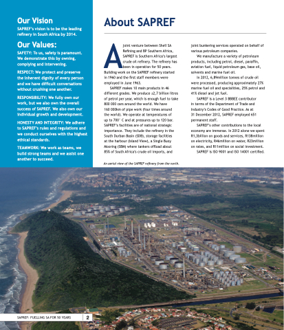 SAPREF’s vision is to be the leading refinery in South Africa by 2014.