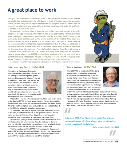 quickly. The additional advantages of company assistance with housing, tertiary education, work-related travel abroad and many other benefits made SAPREF a superb place to work. I retired as a Shutdown Engineer after 30 years, having occupied roles in Maintenance, Safety, Planning, Inspection and Projects. Since then I have served as a church warden and
