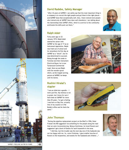 “After 32 years at SAPREF, I can safely say that the most important thing in a company is to recruit the right people and put them in the right places — and SAPREF does that exceptionally well. Also, I have noticed even people who trained only at SAPREF have done well elsewhere; I am talking about the learnerships that SAPREF offers, which is a service to the community and boosts the skills pool out there.”