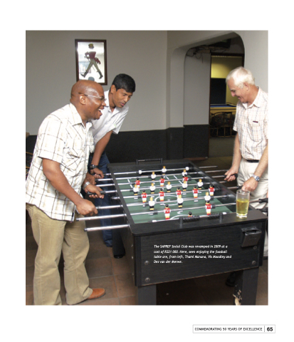 The SAPREF Social Club was revamped in 2009 at a cost of R221 000. Here, seen enjoying the foosball table are, from left, Thami Manana, Vis Moodley and Des van der Merwe. COMMEMORATING 50 YEARS OF EXCELLENCE 65