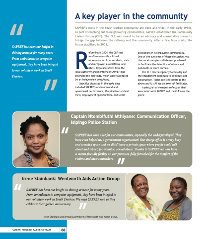 SAPREF’s roots in the South Durban community are deep and wide. In the early 1990s, as part of reaching out to neighbouring communities, SAPREF established the Community Liaison Forum (CLF). The CLF was meant to be an advisory and consultative forum to bridge the gap between the refinery and the community. After a few false starts, the forum stabilised in 2003.