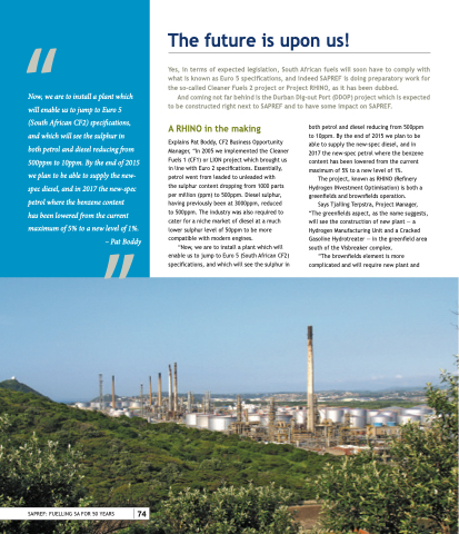 Yes, in terms of expected legislation, South African fuels will soon have to comply with what is known as Euro 5 specifications, and indeed SAPREF is doing preparatory work for the so-called Cleaner Fuels 2 project or Project RHINO, as it has been dubbed.