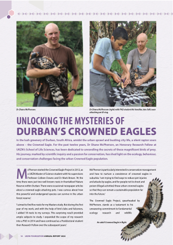 In the lush greenery of Durban, South Africa, amidst the urban sprawl and bustling city life, a silent raptor soars above – the Crowned Eagle. For the past twelve years, Dr Shane McPherson, an Honorary Research Fellow at UKZN’s School of Life Sciences, has been dedicated to unravelling the secrets of these magnificent birds of prey. His journey, marked by scientific inquiry and a passion for conservation, has shed light on the ecology, behaviour, and conservation challenges facing the urban Crowned Eagle population.
