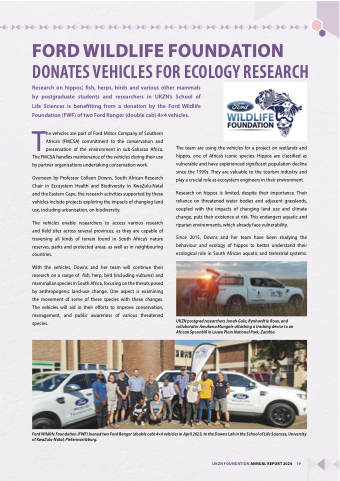 Research on hippos’, fish, herps, birds and various other mammals by postgraduate students and researchers in UKZN’s School of Life Sciences is benefitting from a donation by the Ford Wildlife Foundation (FWF) of two Ford Ranger (double cab) 4×4 vehicles.