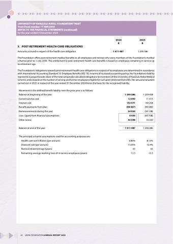The Foundation’s obligations towards post-retirement health care obligations in respect of its employees are determined in accordance with International Accounting Standard 19: Employee Benefits (IAS 19). In terms of its stated accounting policy, the Foundation’s liability represents a proportionate share of the total actuarially calculated obligations for members of the University of KwaZulu-Natal Medical Scheme, and is based on the number of serving and former employees eligible for such post-retirement benefits. The actuarial valuation carried out in 2025 in respect of the year ended 31 December 2024 forms the basis for the recognised liability.