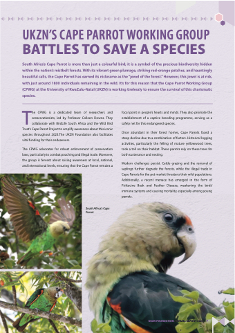 The CPWG is a dedicated team of researchers and conservationists, led by Professor Colleen Downs. They collaborate with BirdLife South Africa and the Wild Bird Trust’s Cape Parrot Project to amplify awareness about this iconic species throughout 2023.The UKZN Foundation also facilitates vital funding for their endeavours.