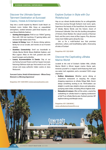 pumping water slides, including Africa’s highest slide. • Relaxation & Leisure: After all the action, unwind by sunbathing on uShaka beach or sipping sundowners at KuD’Ta at uShaka Marine pier, Durban’s premier VIP