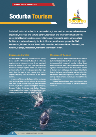 organisers, historical and cultural centres, recreation and entertainment attractions, educational tourism services, conservation areas, restaurants, sports venues, clubs facilities and trails and security for South Durban, which encompasses the Bluff, Wentworth, Mobeni, Jacobs, Woodlands, Montclair, Yellowwood Park, Clairwood, the harbour, Isipingo, Prospecton, Merebank and Wilson’s Wharf.
