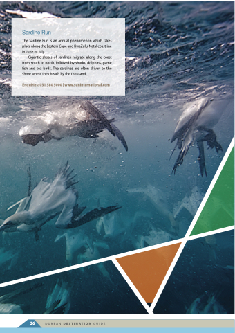 Gigantic shoals of sardines migrate along the coast from south to north, followed by sharks, dolphins, game fish and sea birds. The sardines are often driven to the shore where they beach by the thousand.