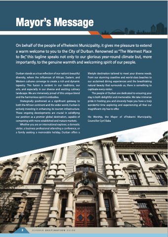 On behalf of the people of eThekwini Municipality, it gives me pleasure to extend a warm welcome to you to the City of Durban. Renowned as “The Warmest Place to Be,” this tagline speaks not only to our glorious year-round climate but, more importantly, to the genuine warmth and welcoming spirit of our people.