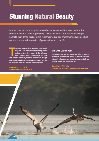 The Green Hub is Durban’s central portal for eco-tourism information and bookings. Based at the uMngeni River Estuary, the Hub arranges canoe trails, nature trails and heritage trails in and around Durban.