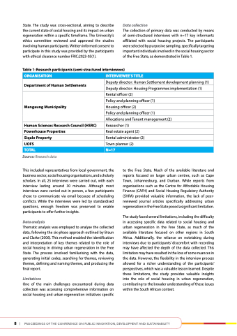 to the Free State. Much of the available literature and reports focused on larger urban centres, such as Cape Town, Johannesburg, and Durban. While reports from organisations such as the Centre for Affordable Housing Finance (CAFH) and Social Housing Regulatory Authority (SHRA) provided valuable information, the lack of peer- reviewed journal articles specifically addressing urban regeneration in the Free State posed a significant limitation.
