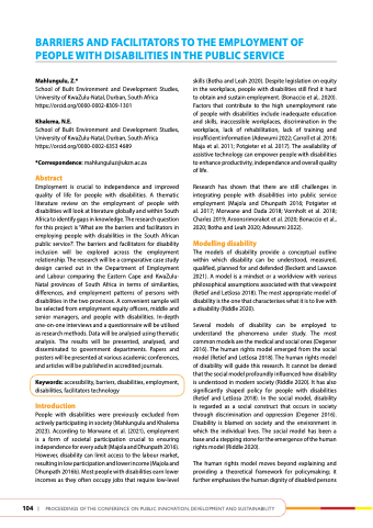Research has shown that there are still challenges in integrating people with disabilities into public service employment (Majola and Dhunpath 2016; Potgieter et al. 2017; Morwane and Dada 2018; Vornholt et al. 2018; Charles 2019; Aroonsrimorakot et al. 2020; Bonaccio et al., 2020; Botha and Leah 2020; Adewumi 2022).