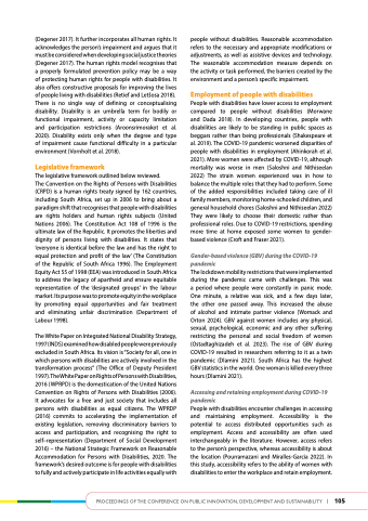 The White Paper on Integrated National Disability Strategy, 1997 (INDS) examined how disabled people were previously excluded in South Africa. Its vision is “Society for all, one in which persons with disabilities are actively involved in the transformation process” (The Office of Deputy President 1997). The White Paper on Rights of Persons with Disabilities, 2016 (WPRPD) is the domestication of the United Nations Convention on Rights of Persons with Disabilities (2006). It advocates for a free and just society that includes all persons with disabilities as equal citizens. The WPRDP (2016) commits to accelerating the implementation of existing legislation, removing discriminatory barriers to access and participation, and recognising the right to self–representation (Department of Social Development 2016) – the National Strategic Framework on Reasonable Accommodation for Persons with Disabilities, 2020. The framework’s desired outcome is for people with disabilities to fully and actively participate in life activities equally with