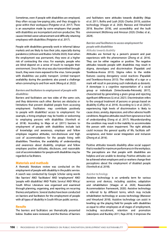 A thematic literature review was conducted on the employment of people with disability in the public service. A search was conducted by Google Scholar using words like ‘barriers’ AND ‘facilitators’ AND ‘employment’ AND ‘people with disabilities’ AND ‘Public Service’ AND ‘Africa/ South Africa’. Literature was organised and examined through planning, organising, and reporting on recurring themes and patterns. Several studies have been conducted on barriers and facilitators for the employment of people with all types of disability in South African public service.