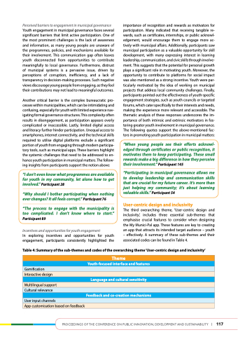 importance of recognition and rewards as motivators for participation. Many indicated that receiving tangible re- wards, such as certificates, internships, or public acknowl- edgement, would encourage them to engage more ac- tively with municipal affairs. Additionally, participants saw municipal participation as a valuable opportunity for skill development, with many expressing interest in learning leadership, communication, and civic skills through involve- ment. This suggests that the potential for personal growth plays a significant role in motivating youth. Moreover, the opportunity to contribute to platforms for social impact was also mentioned as a strong incentive. Youth were par- ticularly motivated by the idea of working on municipal projects that address local community challenges. Finally, participants pointed out the effectiveness of youth-specific engagement strategies, such as youth councils or targeted forums, which cater specifically to their interests and needs, making the experience more relevant and accessible. The thematic analysis of these responses underscores the im- portance of both intrinsic and extrinsic motivators in fos- tering greater youth involvement in municipal governance. The following quotes support the above-mentioned fac- tors in promoting youth participation in municipal matters: