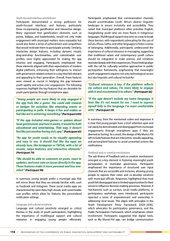 Participants demonstrated a strong preference for youth-focused interfaces and features, particularly those incorporating gamification and interactive design. Many expressed that gamification elements, such as points, badges, and leaderboards, would not only make engagement with municipal matters more enjoyable but would also foster a sense of achievement and competition that would motivate them to participate actively. Similarly, interactive design features, including dynamic visuals, drag-and-drop functionalities, and customisable user profiles, were highly appreciated for making the app intuitive and engaging. Participants emphasised that these elements aligned with their expectations of modern digital platforms, enhancing their willingness to interact with governance-related content in a way that felt relevant and appealing to their generation. Overall, these features were viewed as crucial in bridging the gap between youth apathy and active civic engagement. The following responses highlight the key features that are desirable for youth participation through smartphone apps: