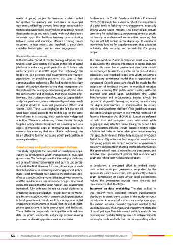 This study highlights the potential of smartphone appli- cations to revolutionise youth engagement in municipal governance. The findings show that these digital platforms are generally perceived as useful and easy to use, consis- tent with the TAM. However, for smartphone apps to reach their full potential in enhancing civic engagement, policy- makers and developers must address the challenges iden- tified by users, including technical issues, privacy concerns, and the need for more responsive app designs. In terms of policy, it is crucial that the South African local government framework fully embraces the role of digital platforms in enhancing public participation. Policies such as the Munic- ipal Systems Act (2000), which governs public participation in local government, should explicitly incorporate digital engagement mechanisms to ensure that the use of smart- phone applications is both encouraged and facilitated. These platforms can provide municipalities with real-time data on youth sentiments, enhancing decision-making processes and making governance more inclusive.