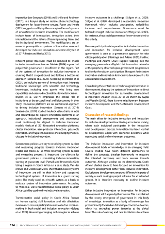 Because participation is imperative for inclusive innovation and innovation for inclusive development, open government is seen as a governance approach to raise citizen participation (Plantinga and Adams 2021). Further, Plantinga and Adams (2021) suggest tapping into the emerging grassroots and hybrid civic innovation networks at the periphery of formal open government programmes to drive further citizen participation. The quest for inclusive innovation and innovation for inclusive development is for a sustainable development.