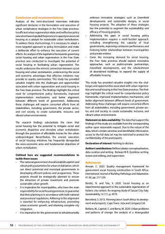 This study has provided valuable insights into the chal- lenges and opportunities associated with urban regenera- tion and social housing in the Free State province. The find- ings highlight the critical need for comprehensive policy frameworks, improved implementation mechanisms, and better alignment between different levels of government. Addressing these challenges will require concerted efforts from all stakeholders, including government, private sec- tor, and civil society, to create sustainable, inclusive, and vibrant urban environments.
