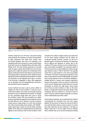 neutralises the evidence. Regular patrols and inspections for the tower footing resistance and HV towers are conducted annually; however, criminals can still act in between patrols. Increasing the frequency of inspections will be difficult and expensive to enforce due to the number of HV towers and due to some of them being in areas with limited accessibility. The estimated length of HV transmission lines is about 28,000 km and the average span between towers is “400 m” (ESI 2021). This typically means that in a span length of 1.2 km, there are probably 3 HV towers. This means conducting line patrols for every tower is not practical or economically feasible. One system that is being explored is the use of artificial intelligence- enabled drones to conduct more frequent inspections; however, this proposal is still in its infancy. A method that can be used to mitigate steel member theft is to use steel monopoles to transmit the high power. These towers do not have any steel members on them as the tower design is a single pole instead of the lattice design. These monopoles will not be attractive to criminals in terms of profit. It must be noted that steel monopoles can only be used in relatively flat areas (UETCL 2024).