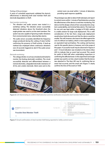 The prototype was able to detect theft attempts and report to control rooms within 1 minute of fault detection, proving the effectiveness of the device in real-time monitoring. The device met the design criteria of low-cost production, long- term sustainability, and minimal false alarms. The total cost for one unit was kept within a budget of R1,600, making it a viable solution for large-scale deployment. This is with consideration of the fact that a large-scale deployment would attract bulk discounts and that the device would be smaller. This will, however, also have to be offset against the cost of a lithium ion battery, which is more expensive than an equivalent lead acid battery. The costing and business case for this specific device is, however, not in the scope of this paper. A successful result may be observed in Figures 6 and 7. A local indication was included on the device (blue LED) to indicate that an event had occurred. This would be useful to field staff when undertaking inspections or confirming the affected tower. In this experiment and angle grinder was used to cut into a steel member that the device was attached to. The blue LED was lit, confirning that an event had occurred, and the email sent (Figure 7) clearly confirms the time of the event at 14:08.