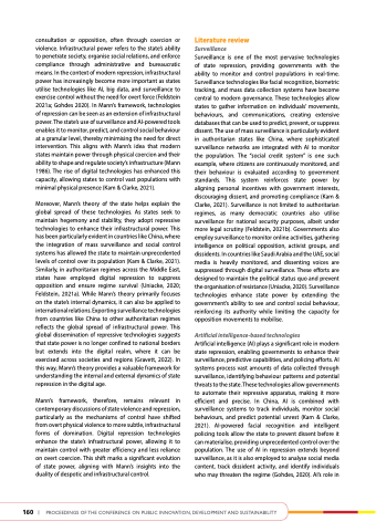 consultation or opposition, often through coercion or violence. Infrastructural power refers to the state’s ability to penetrate society, organise social relations, and enforce compliance through administrative and bureaucratic means. In the context of modern repression, infrastructural power has increasingly become more important as states utilise technologies like AI, big data, and surveillance to exercise control without the need for overt force (Feldstein 2021a; Gohdes 2020). In Mann’s framework, technologies of repression can be seen as an extension of infrastructural power. The state’s use of surveillance and AI-powered tools enables it to monitor, predict, and control social behaviour at a granular level, thereby minimising the need for direct intervention. This aligns with Mann’s idea that modern states maintain power through physical coercion and their ability to shape and regulate society’s infrastructure (Mann 1986). The rise of digital technologies has enhanced this capacity, allowing states to control vast populations with minimal physical presence (Kam & Clarke, 2021).