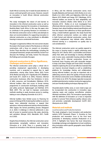 in Africa, and the informal construction sector, more broadly (Babalola and Harinarain 2024; Eliufoo et al. (n.d.); Mselle et al. 2023; Coffie and Aigbavboa 2020; Nor and Masron 2019; Mselle and Sanga, 2017; Wambugu, 2013). Informal builders are known for their adaptability and innovative solutions (Eliufoo 2020; Kühne et al. 2019; Kemwita 2019). Eliufoo et al. (n.d.) investigated how effectively informal construction workers in Dar es Salaam, Tanzania, learn about building material specifications and how this impacts their adherence to those specifications. Using a mixed-methods approach, the study found that while informal construction workers are widely used in both formal and informal construction sectors, their continued employment may indicate either effective informal training or a compromise on quality due to cost considerations.