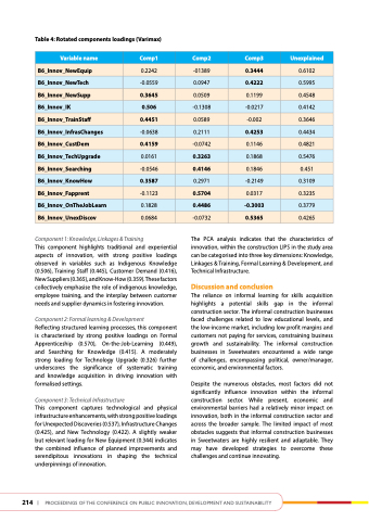 The PCA analysis indicates that the characteristics of innovation, within the construction LIPS in the study area can be categorised into three key dimensions: Knowledge, Linkages & Training, Formal Learning & Development, and Technical Infrastructure.