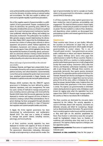 Zimbabwe, Rwanda, and Egypt have unique kinds of gov- ernmentality, formed by each country’s complicated history, political economy, and cultural dynamics. Governmentality is a tool that can be employed for good or bad. Governments have employed governmentality in Egypt, Rwanda, and Zimbabwe to uphold social order and quell political dissent.