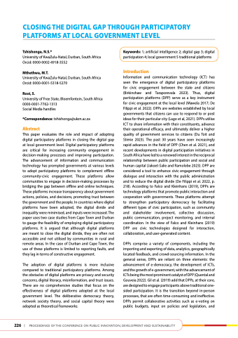 Information and communication technology (ICT) has seen the emergence of digital participatory platforms for civic engagement between the state and citizens (Birkinshaw and Taraporevala 2023). Thus, digital participation platforms (DPP) serve as a key instrument for civic engagement at the local level (Mawela 2017; De Filippi et al. 2022). DPPs are websites established by local governments that citizens can use to respond to or post ideas for their particular city (Lago et al, 2021). DPPs utilise ICT to share information with their constituents, advance their operational efficacy, and ultimately deliver a higher quality of government services to citizens (Du Toit and Stimie 2023). The past 30 years have seen increasingly rapid advances in the field of DPP (Chen et al. 2021), and recent developments in digital participation initiatives in South Africa have led to a renewed interest in the reciprocal relationship between public participation and social and human capital (Jakoet-Salie and Ramolobe 2023). DPP are considered a tool to enhance civic engagement through dialogue and interaction with the public administration and to reduce the digital divide (De Filippi et al. 2022, p. 218). According to Falco and Kleinhans (2019), DPPs are technology platforms that promote public interaction and cooperation with governments. These platforms attempt to strengthen participatory democracy by facilitating different types of civic participation, such as community and stakeholder involvement, collective discussion, public communication, project monitoring, and internal coordination. In the view of Falco and Kleinhans (2019) DPP are civic technologies designed for interaction, collaboration, and user-generated content.