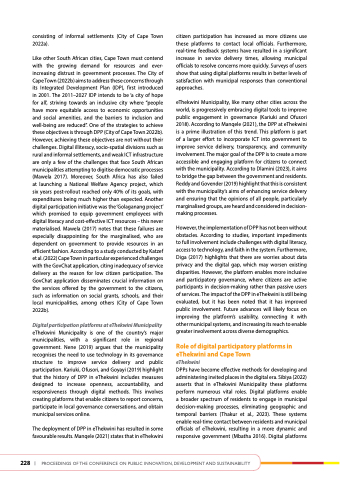 DPPs have become effective methods for developing and administering invited places in the digital era. Sibiya (2022) asserts that in eThekwini Municipality these platforms perform numerous vital roles. Digital platforms enable a broader spectrum of residents to engage in municipal decision-making processes, eliminating geographic and temporal barriers (Thakur et al., 2023). These systems enable real-time contact between residents and municipal officials of eThekwini, resulting in a more dynamic and responsive government (Mbatha 2016). Digital platforms