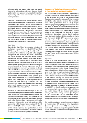 DPPs mark a substantial shift in the idea of invited venues for community development. In the context of eThekwini Municipality, these platforms provide great prospects to increase public involvement, improve urban government, and handle complex metropolitan concerns (Mnguni 2019). However, successful implementation necessitates a comprehensive examination of local circumstances, existing disparities, and technical infrastructure. By resolving the issues and implementing the recommended activation methods, eThekwini Municipality may realise the full potential of DPP to promote more inclusive, responsive, and effective urban administration.