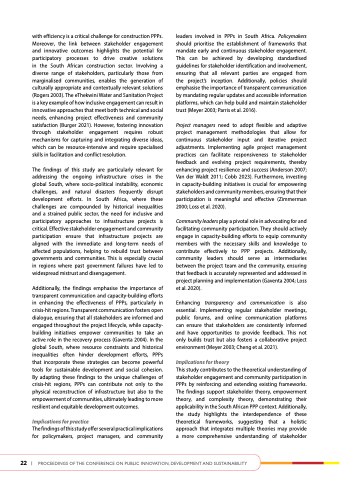 with efficiency is a critical challenge for construction PPPs. Moreover, the link between stakeholder engagement and innovative outcomes highlights the potential for participatory processes to drive creative solutions in the South African construction sector. Involving a diverse range of stakeholders, particularly those from marginalised communities, enables the generation of culturally appropriate and contextually relevant solutions (Rogers 2003). The eThekwini Water and Sanitation Project is a key example of how inclusive engagement can result in innovative approaches that meet both technical and social needs, enhancing project effectiveness and community satisfaction (Burger 2021). However, fostering innovation through stakeholder engagement requires robust mechanisms for capturing and integrating diverse ideas, which can be resource-intensive and require specialised skills in facilitation and conflict resolution.
