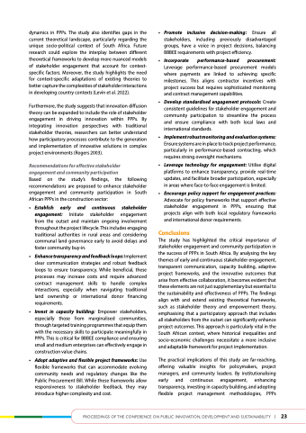 dynamics in PPPs. The study also identifies gaps in the current theoretical landscape, particularly regarding the unique socio-political context of South Africa. Future research could explore the interplay between different theoretical frameworks to develop more nuanced models of stakeholder engagement that account for context- specific factors. Moreover, the study highlights the need for context-specific adaptations of existing theories to better capture the complexities of stakeholder interactions in developing country contexts (Levin et al. 2022).
