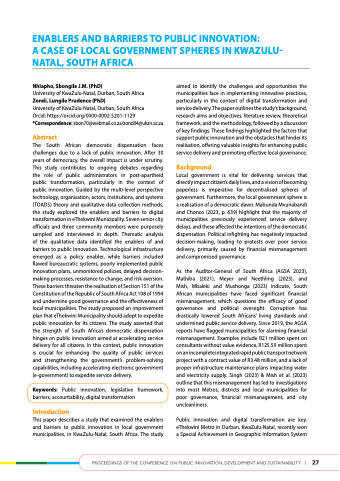 This paper describes a study that examined the enablers and barriers to public innovation in local government municipalities, in KwaZulu-Natal, South Africa. The study