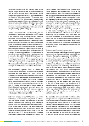 camera coverage in real time and raises the alarm when certain behaviours are detected (Kwet 2019, p. 4). The Khayelitsha Report (2014, Recommendation 18, para 87) also recommended increasing surveillance, especially the use of CCTV in key areas such as transportation centres and educational institutions, to promote safety and control crime. Controlled aggressiveness of humans can also be ‘reinforced’ by using AI surveillance techniques, which can support proactive prevention strategies in policing rather than continue to allow reactive measures.