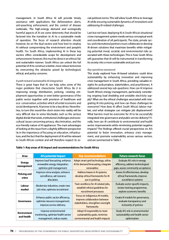 management. In South Africa AI will provide timely assistance with applications like deforestation alerts, anti-poaching enforcement, and the control of disease outbreaks. The high-energy demand and ecologically harmful aspects of AI are some deterrents that should be factored into the transition to AI to a sustainable mode of operation. The focus of research attention should, however, be on the dual sectors and how best to employ AI without compromising the environment and people’s health. For South Africa, implementing AI in these key sectors offers considerable scope for development and enhancement; however, this must be done in an ethical, fair and sustainable manner. South Africa can unlock the full potential of AI to construct a better, more robust tomorrow by overcoming the obstacles posed by technological, ethical, and policy concerns.