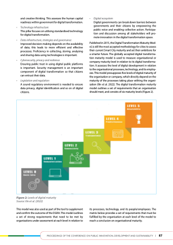 Published in 2015, the Digital Transformation Maturity Mod- el, is still the most accepted methodology for cities to assess their current Smart City maturity and set their ambitions for a smarter future. The globally accepted digital transforma- tion maturity model is used to measure organisational or company maturity level in relation to its digital transforma- tion. It assesses the level of digital development in relation to the organisational processes, technology, and its employ- ees. This model presupposes five levels of digital maturity of the organisation or company, which directly depend on the maturity of the processes taking place withing the organi- sation (Ilin et al. 2022). The digital transformation maturity model outlines a set of requirements that an organisation should meet, and consists of six maturity levels (Figure 2).