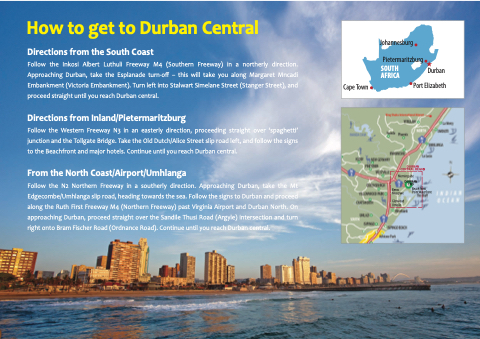 Follow the Inkosi Albert Luthuli Freeway M4 (Southern Freeway) in a northerly direction. Approaching Durban, take the Esplanade turn-off – this will take you along Margaret Mncadi Embankment (Victoria Embankment). Turn left into Stalwart Simelane Street (Stanger Street), and proceed straight until you reach Durban central.
