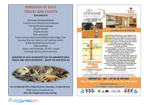 Tel: +27 (0)68 558 3377/+27 (0)61 463 2413 | WhatsApp: +27 (0)61 463 2413 Email: kingdomofzulu@gmail.com Web: http://kingdomofzulu.wix.com/king 42 DURBAN CENTRAL TOURISM Visitor’s Guide