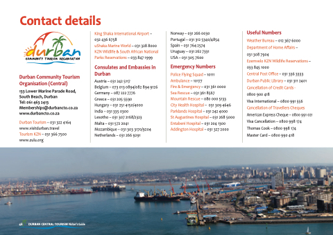Durban Tourism – 031 322 4164 www.visitdurban.travel Tourism KZN – 031 366 7500 www.zulu.org