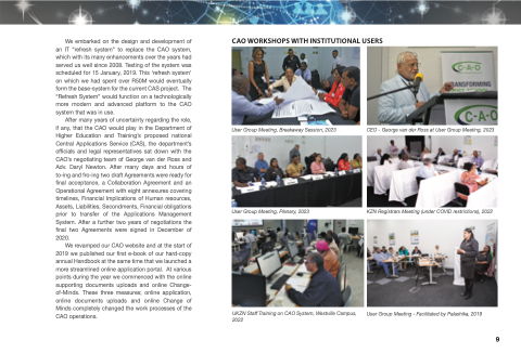 After many years of uncertainty regarding the role, if any, that the CAO would play in the Department of Higher Education and Training’s proposed national Central Applications Service (CAS), the department’s officials and legal representatives sat down with the CAO’s negotiating team of George van der Ross and Adv. Daryl Newton. After many days and hours of to-ing and fro-ing two draft Agreements were ready for final acceptance, a Collaboration Agreement and an Operational Agreement with eight annexures covering timelines, Financial Implications of Human resources, Assets, Liabilities, Secondments, Financial obligations prior to transfer of the Applications Management System. After a further two years of negotiations the final two Agreements were signed in December of 2020.