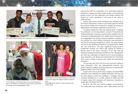 As part of the drive to get the CAO compliant, the first B-BBEE verification was undertaken by AQRate Verification Services and the CAO gained a Level One Certificate. A strategic planning workshop facilitated by Dr Lumkile Lalende of UKZN was held in August, where CAO managers and supervisors interacted as equals with CAO Board Directors.