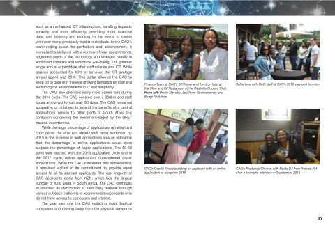 The CAO also attended many more career fairs during the 2014 cycle. The CAO covered over 7 000km and staff hours amounted to just over 80 days. The CAO remained supportive of initiatives to extend the benefits of a central applications service to other parts of South Africa but confusion concerning the model envisaged by the DHET caused uncertainties.