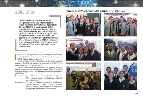 Discussions in 2003 centred around the incorporation of the CAO into the National Higher Education Information and Applications Service (NHEIAS). It was proposed that an interim Steering Committee be set up by the Minister in September 2003. The first phase of the NHEIAS would be for the existing CAO/esATI member institutions for the 2005 cycle. The second phase would incorporate the next group of institutions to join and by 2007 all institutions would fall under NHEIAS. Institutions had until end March 2003 to submit their views on the National Plan.