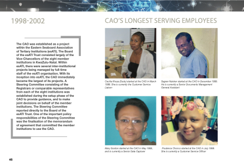 The CAO was established as a project within the Eastern Seaboard Association of Tertiary Institutions (esATI). The Board of the esATI Trust consisted largely of the Vice-Chancellors of the eight member institutions in KwaZulu-Natal. Within esATI, there were several inter-institutional projects being managed by full-time