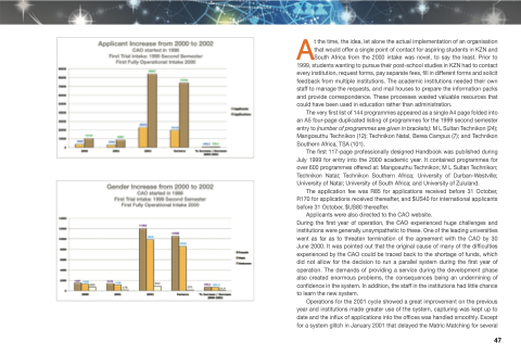 During the first year of operation, the CAO experienced huge challenges and institutions were generally unsympathetic to these. One of the leading universities went as far as to threaten termination of the agreement with the CAO by 30 June 2000. It was pointed out that the original cause of many of the difficulties experienced by the CAO could be traced back to the shortage of funds, which did not allow for the decision to run a parallel system during the first year of operation. The demands of providing a service during the development phase also created enormous problems, the consequences being an undermining of confidence in the system. In addition, the staff in the institutions had little chance to learn the new system.