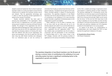 remember them fondly, as well as those that have left for greener pastures. The Board has throughout its 25-year history, provided stability in respect of ensuring good governance. The seamless integration of new Board members over the 25 years all sharing a common vision of contributing to the wellbeing of our post schooling system has been a significant contributing factor to the organization’s growth and stability.