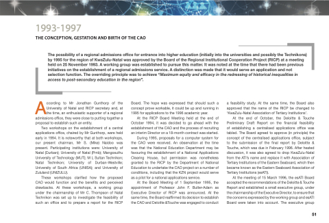 The possibility of a regional admissions office for entrance into higher education (initially into the universities and possibly the Technikons) by 1995 for the region of KwaZulu-Natal was approved by the Board of the Regional Institutional Cooperation Project (RICP) at a meeting held on 25 November 1993. A working group was established to pursue this matter. It was noted at the time that there had been previous initiatives on the establishment of a regional admissions service. A distinction was made that it would serve an application and not selection function. The overriding principle was to achieve “Maximum equity and efficacy in the redressing of historical inequalities in access to post-secondary education in the region”.